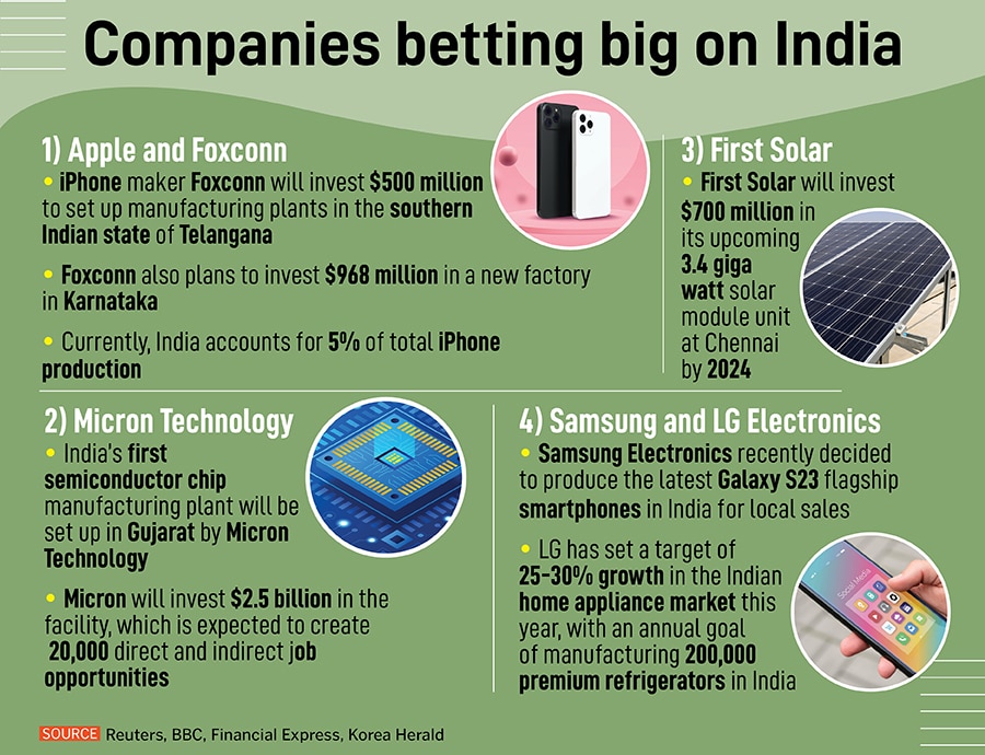 And last fortnight, coinciding with Prime Minister Narendra Modi’s US visit, chip-maker Micron Technology sealed a deal to set up a semiconductor facility in Gujarat. Reports also suggest that South Korean tech giants Samsung and LG Electronics have moved their production operations away from China due to growing uncertainties and are looking very closely at the world"s fifth-largest economy.