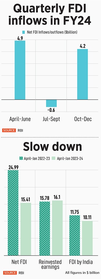 Net FDI in India plunged over 38 percent in the first 10 months of financial year 2024 to $15.42 billion mainly due to a rise in repatriation, shows Reserve Bank of India (RBI) data. In the same period of April 2022-January 2023, FDI in India was at $24.99 billion.