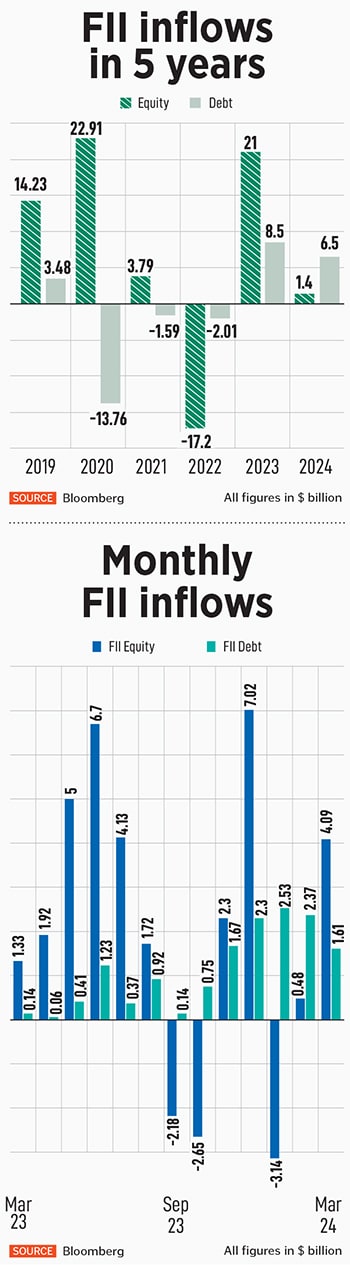 However, the once-ignored debt segment is getting all the attention by FIIs. FIIs have pumped $6.5 billion into debt in 2024 so far following a record $8.5 billion inflows in 2023. In March, the debt segment received $1.61 billion FII inflow.