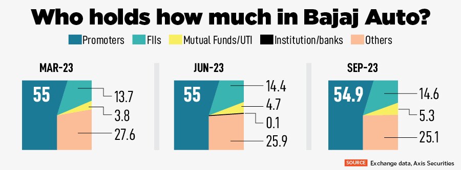 Mutual funds such as SBI Large & Midcap Fund hold 1.34 percent, LIC of India holds 1.13 percent while foreign portfolio investors (FPI) hold 14.65 percent in Bajaj Auto.