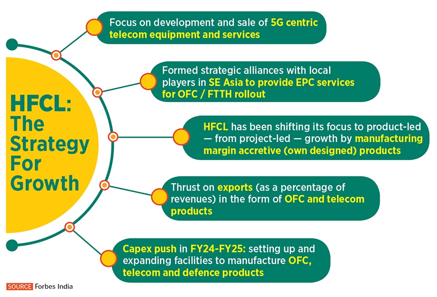 Nahata started HFCL in 1987, once manufacturing transmission equipment in collaboration with Southeast Asian companies. But in the years and decades to follow, when India started to grow and expand its telecom networks, the optical fiber cables (OFC) business became its engine for growth. Since 2015, HFCL has shifted its focus towards exporting telecom equipment and optical fiber cables to over 30 countries at present, from 16 in FY15. Exports form 18 percent share of revenues, HFCL’s June-ended data shows.
