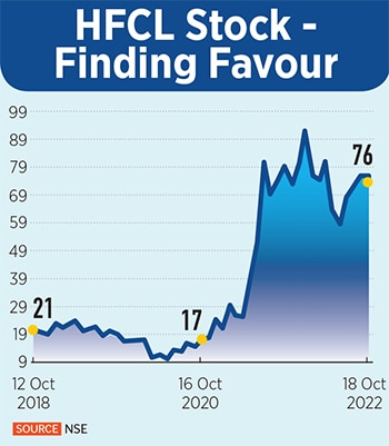 The HFCL stock has risen near four times or 265 percent in the past four years (see chart), echoing the improved business performance.
