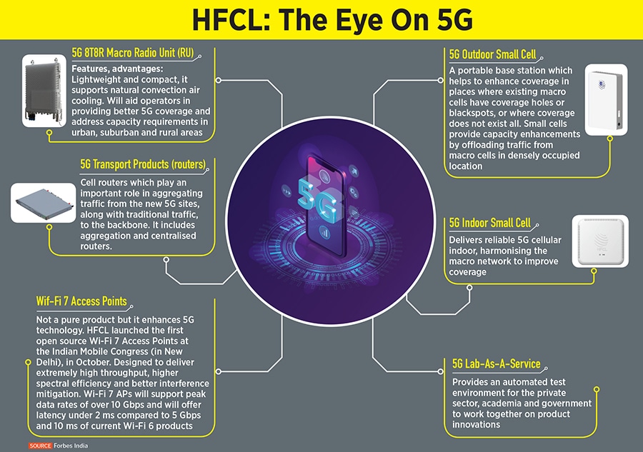 It is the same business acumen which has worked for Nahata and the company to concentrate on manufacturing and sale of 5G-centric products. “We are designing our own equipment and have IPRs for the same," Nahata tells Forbes India on call. HFCL is designing an entire range of 5G related telecom equipment, including wireless access network 8T8R macro radio unit (see chart). Another product is a 120 Gbps cell site router which helps aggregate traffic from the new 5G sites to the backbone (a high speed line forming the fastest path through the network). The company is also working to develop global system integration services for 5G private networks and integration services.