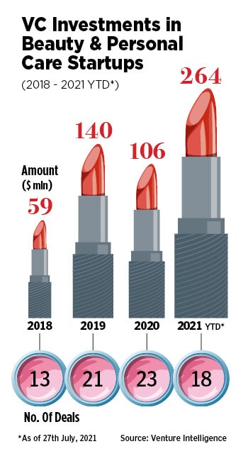 Awareness among investors is also increasing. The beauty and personal care space (BPC) has been on a tear since the start of this year. A total of $264 million in funding has flowed into startups just in the seven months to July 2021, compared to $106 million in the whole of 2020. A total of 18 deals have been struck in the year so far compared to 23 in 2020.