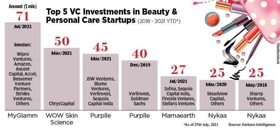 Mega deals like the Wipro Ventures and Amazon-led $71 million Series C round in MyGlamm in July 2021, ChrysCapital’s $50 million investment in Wow Skin Science and the Sequoia Capital India-led $45 million fundraise in beauty marketplace Purplle, both in March 2021, are the largest fund raises in the space since 2018.