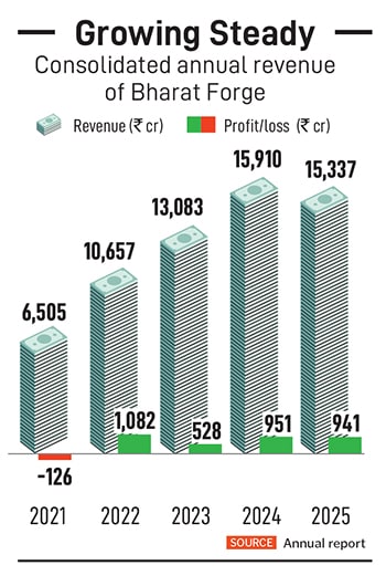 It is the fifth vertical, defence, under which Bharat Forge manufactures everything from protected vehicles to artillery and ammunition and tanks, that is redefining the group and preparing it for its next phase of growth. In Kalyani’s assessment, the defence vertical will likely eclipse Bharat Forge’s core auto components business as the largest in the group in terms of revenue. Bharat Forge has established a subsidiary, Kalyani Strategic Systems Limited, to focus on the defence business.