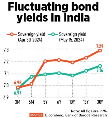 The US 10-year treasury yields were volatile in April and May, rising 48 bps in April. By May 15, it had hit 4.43 percent, cooling off 34 percent in nearly a month. Globally, bond markets have been volatile, mostly due to stronger-than-expected US inflation data and rising geo-political tensions. As a result, the yields on US treasuries rose significantly. Indian government bond yields too mirrored the moves of the US treasury and rose 14 bps to 7.2 percent in April.
