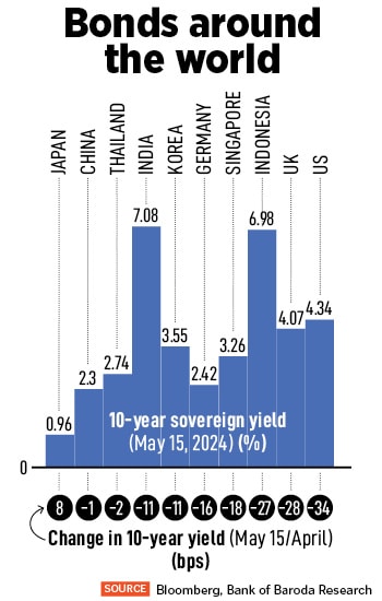 Yadav explains that Indian 10-year yields will rally (as bond inflows and rate cuts get priced in) but they may find it difficult to breach 6.7-6.5 percent. “By Q4FY25 the sugar rush of bond inclusion will be behind us, probably yields will sell off, unless global and Indian rate cuts and falling global yields provide counter pressure," he says.