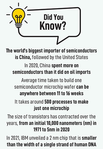 Semiconductors, or chips, are used in most major electronic devices, from smartphones and televisions to automobiles, rockets, and even military weapons. For the last two years, in the wake of the Covid-19 pandemic, there has been a global chip shortage. Usually, a cyclic drought lasts for a year at most, but the current one is only expected to end by early 2024.It all started with the onset of the pandemic, when car manufacturers reduced their semiconductor chip orders due to a decline in sales. Additionally, with most of the employees working remotely, the need for digital devices skyrocketed. The demand for smartphones and other electronic items like PlayStations also grew as more people spent time indoors during the lockdown.