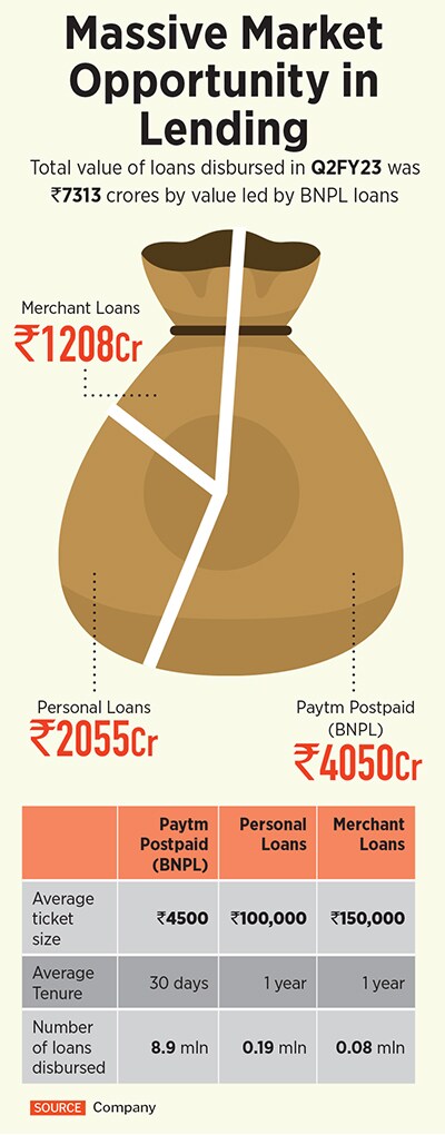 Paytm’s credit strategy is three-pronged: Of the Rs 7,313 crore of loans disbursed by Paytm this quarter, 55 percent of them by value were buy-now-pay-later loans (BNPL) or what the company calls Paytm Postpaid. Twenty-eight percent were personal loans to consumers and 17 percent to merchants. The latter are high-margin loans with average ticket sizes of Rs 1 lakh and Rs 1.5 lakh respectively, whereas the low-margin BNPL loans have average ticket sizes of Rs 4,500.