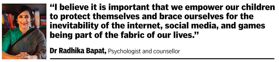Dr Radhika Bapat, a cross-cultural psychologist and counsellor, says the technology landscape is ever evolving it is all-pervasive and ubiquitous in our lives, and it would be incorrect to either vilify or venerate this trend. “Personally, I believe it is important that we empower our children to protect themselves, and brace ourselves for the inevitability of the internet, social media, and games being part of the fabric of our lives."