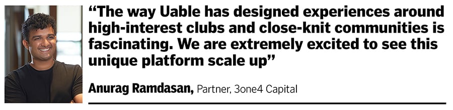 Anurag Ramdasan, partner at 3one4 Capital, believes Uable has had an “interesting and iterative journey since inception." “Saurabh, with his entire career being a commitment to the next generation, made us want to partner with Uable. The way it has designed experiences around high-interest clubs and close-knit communities is fascinating. We are incredibly bullish about what Saurabh is doing and are extremely excited to see this unique platform scale up," he says.
