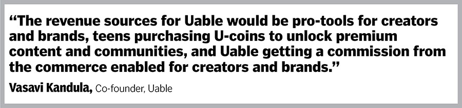 The revenue sources for Uable would be pro-tools for creators and brands, teens purchasing U-coins to unlock premium content and communities, and Uable getting a commission from the commerce enabled for creators and brands," explains Kandula (37), an IIT-Madras graduate.