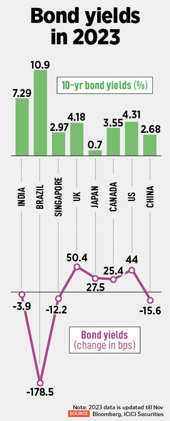 He explains that 2023 was a year when central banks tended to either increase their policy rates or provide indirect guidance of not being in a position to lower rates due to inflation concerns. “The markets have been reading into the language of central bankers and responding accordingly. Hence there has been a tendency for bond yields to increase across the world. This will continue until such time there is a definite reversal in policy stance of the central banks. However, it has been seen towards the end of the year that signals of no more rate hikes have tended to assuage yields and lift prices. Albeit marginally," Sabnavis elaborates.