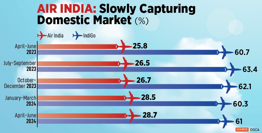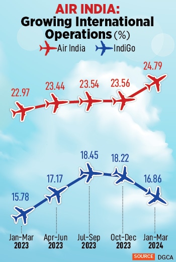 And there might just be a growing case for it. From a market share of 26.7 percent in the domestic market between October and December 2023, Air India group’s market share has grown to 29.1 percent in the quarter between April and June this year. On the international routes, from a market share of 23.56 percent during the October-December quarter in 2023, the Air India group has grown its share to 24.79 percent during the January-March quarter IndiGo has seen that number decline from 18.22 percent to 16.86 percent. The Directorate General of Civil Aviation (DGCA) is yet to release data for the April to June quarter.