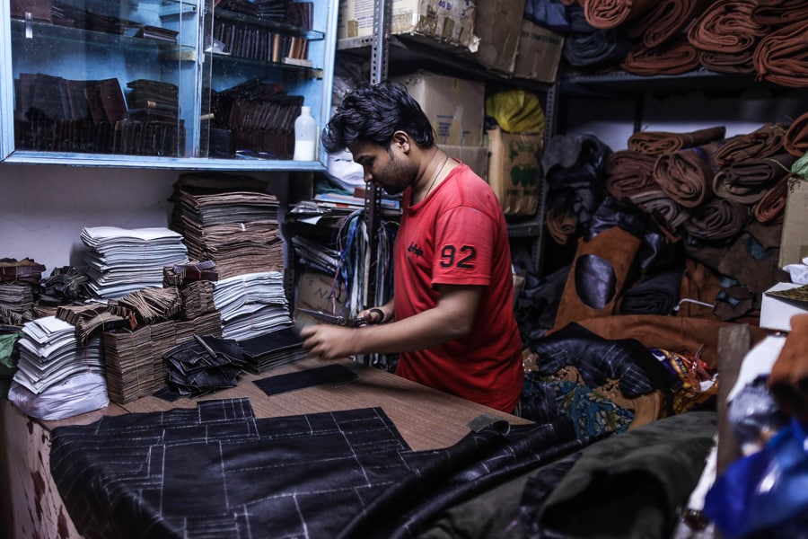 A worker cuts leather for a wallet at a leather workshop in the Dharavi, Mumbai. Image by Dhiraj Singh/Bloomberg via Getty Images