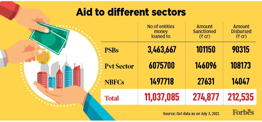 As per government data released in July 2021, Rs 2.75 lakh crore (of the Rs 4.5 lakh crore), has been sanctioned to 11 million businesses banks have disbursed Rs 2.13 lakh crore of this.
