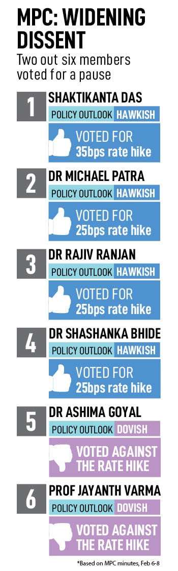 What Goyal and Varma see as overtightening the other four members see as a code to crack persistent high core inflation.