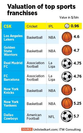 1. Scarcity. The IPL, like the NBA or the NFL, is a closed ecosystem of teams with no promotion or relegation (unlike the EPL and other football leagues), thus guaranteeing teams a share of revenues each season. With the IPL stopping the expansion at 10 teams, there is appetite to participate in their business model and a bit of premium is added on to the share price (the possibility of an exit later on because CSK might be planning for an IPO at some stage also drives that higher price expectations, much like it happened during Manchester United"s IPO).