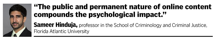 Sameer Hinduja, a professor in the School of Criminology and Criminal Justice at Florida Atlantic University, who has conducted thorough research on the topic, says it is known that adolescents targeted via cyberbullying report increased depression, anxiety, loneliness, suicidal behaviour, and somatic symptoms. “The public and permanent nature of online content compounds the psychological impact—when humiliating content is shared on social media or other environments, it can be viewed by hundreds or thousands of peers, which, of course, increases feelings of shame and helplessness," says the co-director of the Cyberbullying Research Center, and faculty associate at the Berkman Klein Center at Harvard University.