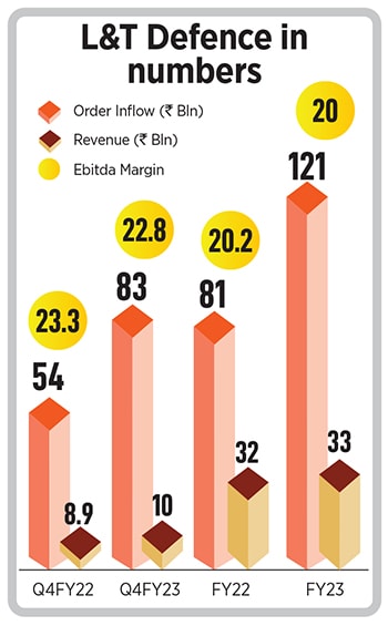 In FY23, the company had order inflows of over Rs 12,000 crore, up from Rs 8,000 crore in FY22 (see box). Market intelligence and advisory firm Mordor Intelligence had in June 2022 pointed out that L&T’s experience in ship and submarine building will be the leading factor for the company’s growth as India plans to procure numerous modern ships and submarines for the Navy.