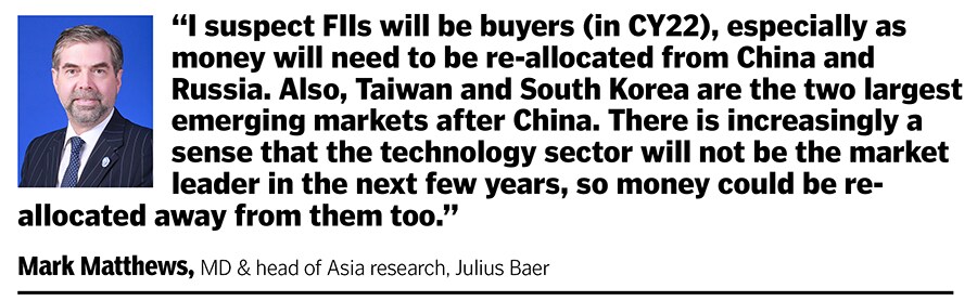 “I suspect FIIs will be buyers, especially as money will need to be re-allocated from China and Russia. Also, Taiwan and South Korea are the two largest emerging markets after China. There is increasingly a sense that the technology sector will not be the market leader in the next few years, so money could be re-allocated away from them too," says Matthews.