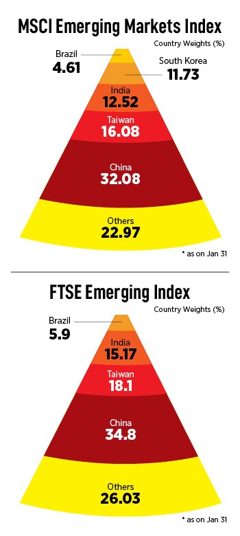 India and China roughly comprise around half the country allocations in most emerging market indices (see chart). China has the maximum weightage in the MSCI Emerging Markets Index and FTSE Emerging Index at 32.08 percent and 34.8 percent respectively.