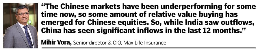 “The Chinese markets have been underperforming for some time now, so some amount of relative value buying has emerged for Chinese equities. So, while India saw outflows, China has seen significant inflows in the last 12 months. Given the size of the Chinese markets, the absolute numbers are significantly bigger than what we would see for India," Vora explains.