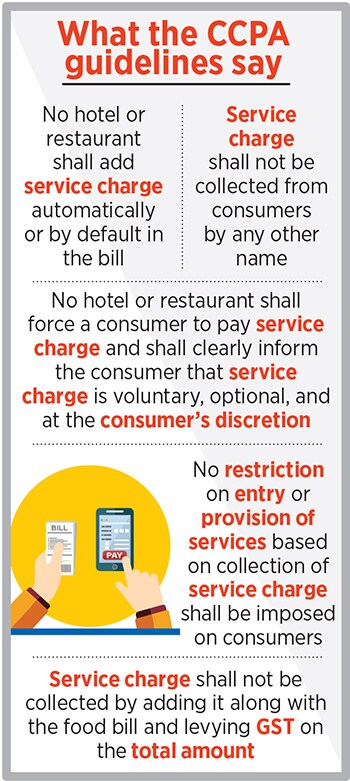 Earlier this week, the Central Consumer Protection Authority (CCPA), which was set up by the Ministry of Consumer Affairs, Food and Distribution in July 2020, announced five major guidelines that say no restaurant or hotel shall add service charge by default or by rechristening it, neither can they force a customer to pay it or restrict services based on it. Last, it says, a service charge shall not be collected by adding it along with the food bill and levying a GST on it.