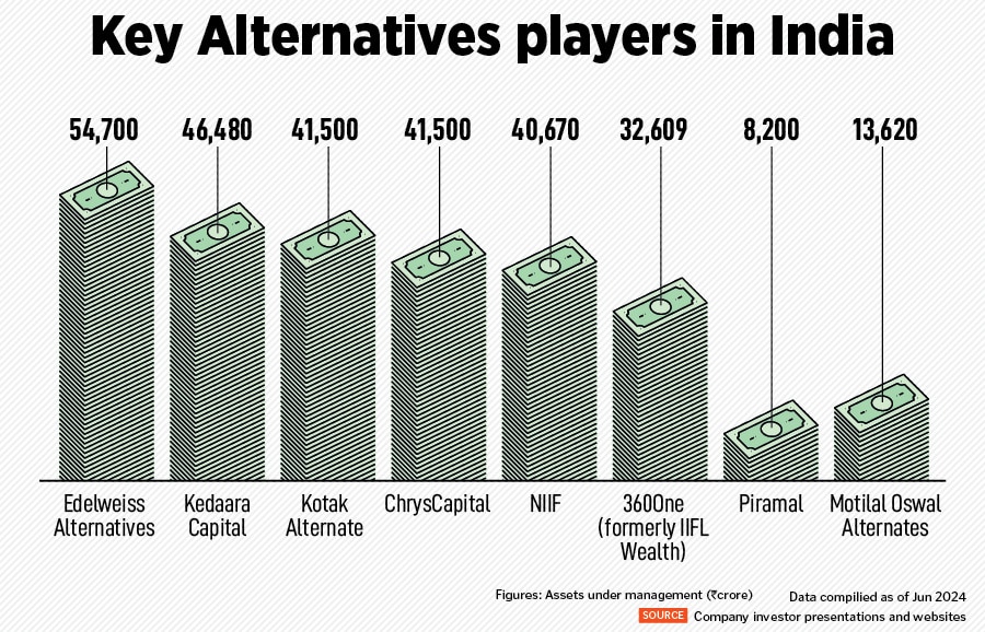 The alternatives space is not too crowded but it has companies which are starting to find their niche strengths. Both Edelweiss Alternative Asset Advisors and Kotak Alternate Asset Managers have a track record in private credit, real assets and building domestic teams (see size chart). Other players such as Kedaara Capital and ChrysCapital have a strong track record in raising private equity.