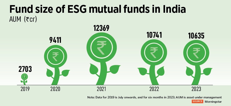 Picture this: Fund size worth a meagre Rs2,703 crore in 2019 more than tripled to Rs9,411 crore in a year, and then rose to Rs12,369 crore in 2021, shows the analysis. However, starting 2022, AUM of ESG-focussed funds started to dwindle—to Rs10,741 crore and it further fell to Rs10,635 crore in the first six months of 2023.