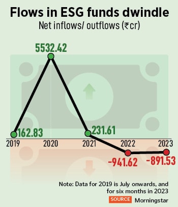 The trend follows a similar script even for flows. ESG -focussed funds have seen the highest outflow ever in 2022 worth Rs941.62 crore. For three consecutive years starting 2019, ESG funds continued to see net inflows peaking at Rs5,532.42 crore in 2020 when six new schemes were launched in the category. In the six months of 2023, ESG schemes have seen a net outflow of Rs891.53 crore.