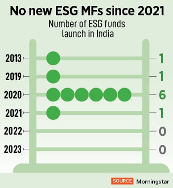 Adding to the woes, there has not been a single ESG fund launch in the two years after 2021. In 2020, as investors grew conscious of climate risks, India saw six additions of ESG schemes, followed by only one the following year and none thereafter.