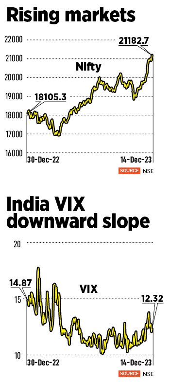 “The VIX has an inverse correlation with equity markets, so during the start of the year post-Budget there was an increase in volatility due to Adani-related news, thereafter it cooled off and Nifty made a new life-time high. Then Israel-Palestine war led to a little volatility in markets and later due to the cease fire, volatility cooled off. Inflation worries have also dropped as the central bankers have paused an increase in rate hikes, hence markets are forming higher and life-time highs, so VIX cooled off. The five state elections are also well in favour of the incumbent government, so that too led to cooling of VIX. Now there are fewer uncertainties so VIX is falling and equity market is rising," Thakkar says.