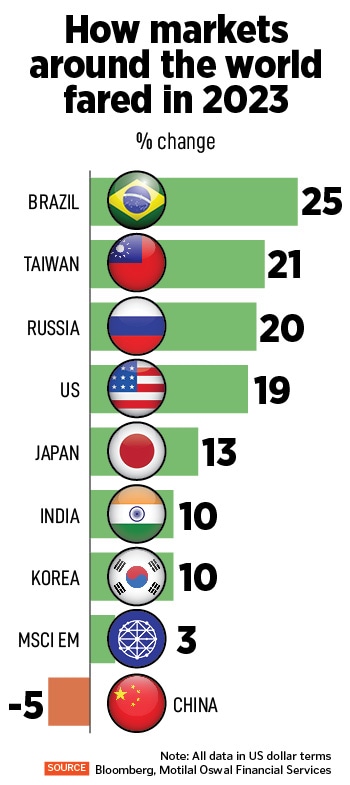“The Indian stock markets saw a spectacular run in 2023 with rallies in many industries and multi-caps. Index heavyweights like HDFC Bank and Reliance Industries, which together account for almost 20 percent of the Nifty50 weightage, have recently started to cash in on the momentum," says Singh.