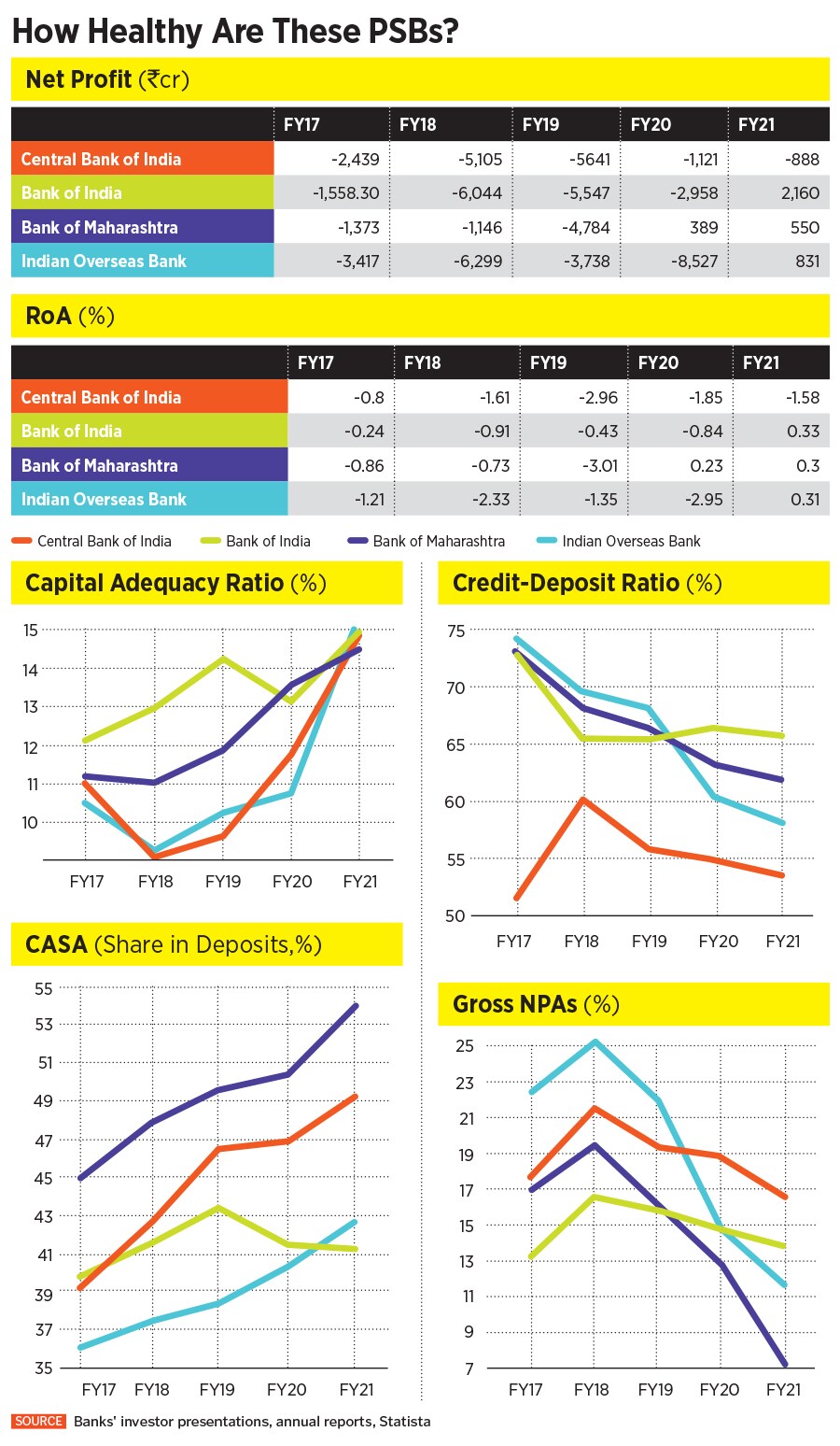 But on the loan book side, fresh loan growth will continue to be challenging in months ahead, even as the pandemic’s second wave recedes. With Indian Overseas Bank and Central Bank still under the PCA, the biggest challenge for any potential acquirer will be to bring in a substantial amount of capital. Even when the banks emerge from the PCA, it will be a challenge for their managements to improve the low or negative return on assets.
