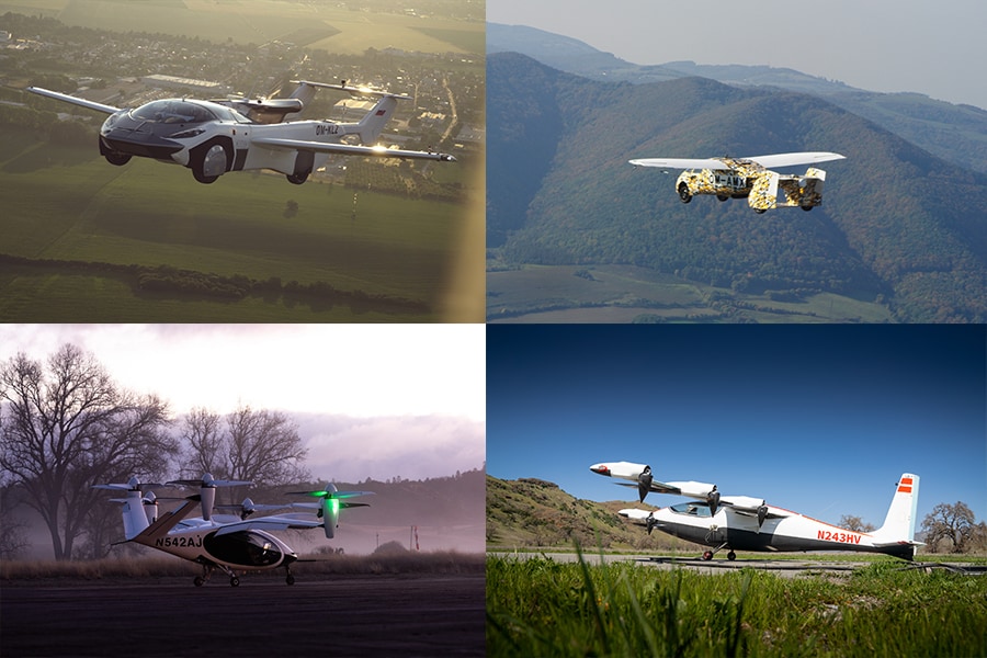 (Clockwise from Top Left) Klein Vision"s AirCar during its its first inter-city flight Test flights of AeroMobil"s The Flying Car experimental prototype Kitty Hawk’s Heaviside eVTOL vehicle Joby’s full-scale, all-electric prototype preparing for flight in California