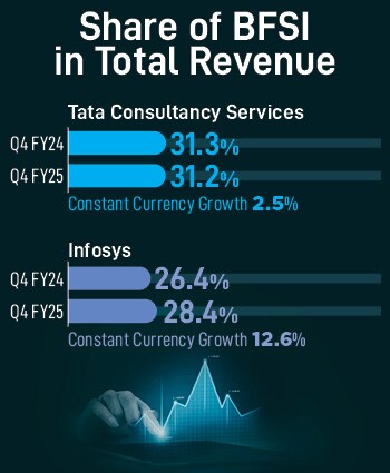 Tata Consultancy Services and Infosys, India’s two biggest IT companies, entered their new fiscal year on a relatively strong footing, despite the global macroeconomic uncertainty. One important reason for this was that clients in the financial services sector, who account for the biggest chunk of revenue at the Indian IT giants, did well, and as a result handed out robust contracts to them—including in Q4 of FY25.