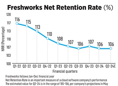 Even as Freshworks’s revenues have gone from $498 million for FY22 to a projected $695-705 million for FY24, growth has halved from 34 percent to the 17-18 percent estimated for the current fiscal year. Reasons include a combination of macroeconomic factors and a broad reversal in tech spending in the US from the initial post-Covid surge.