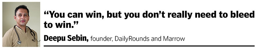 Sebin explains what went wrong. The business model of DailyRounds, he underlines, revolved around a structure where pharma companies would be the buyers. Sebin had built a digital version of pharma detailing, which was supposed to be a much superior rendition of what medical representatives used to do. The idea was to connect doctors and pharma companies in a much efficient and qualitatively better fashion. There was one small glitch, though. Indian pharma operates in a different manner. “They want in-person visits of medical reps to the doctors," he says. What made things worse for Sebin was that he didn’t have any method to track the ROI (return on investment). “There were a lot of gaps. It was not a pharma problem. It was mostly our problem," he confesses.