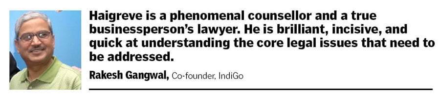 “Haigreve is a phenomenal counsellor and a true businessperson’s lawyer," says Rakesh Gangwal, the co-founder of IndiGo, India’s largest airline by market share. “He is brilliant, incisive, and quick at understanding the core legal issues that need to be addressed. Above all, his ethical standards and humility stand out. It is no surprise that he has a remarkable and dedicated legal team working with him and has built a preeminent law firm."