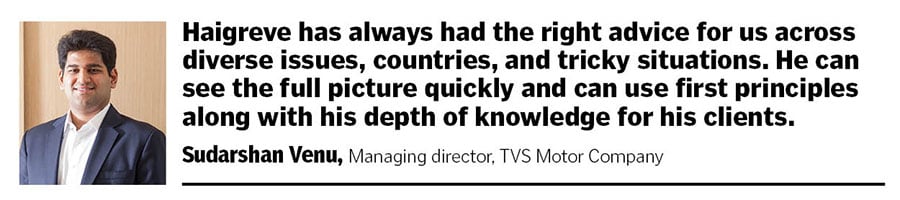 “Haigreve has always had the right advice for us across diverse issues, countries, and tricky situations," says Sudarshan Venu, the managing director of TVS Motor Company. “He can see the full picture quickly and can use first principles along with his depth of knowledge to offer the kind of outcomes that clients look for. He has an innate wisdom in how he deals with matters, which is reassuring because we believe that growing a business also involves trusting your intuition."