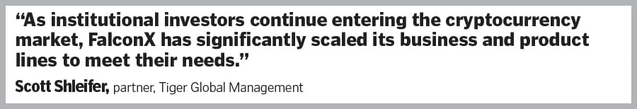 Second comes impact. Raising over $430 million from the world’s leading investors, FalconX has emerged as one of the fastest and most valuable crypto prime brokerages in the world. Its crypto-as-a-service offering powers global banks, fintech institutions and investment applications to easily add crypto to their product offerings. The goal is to enable the next billion users to enter the crypto space. Well, that’s some kind of impact.