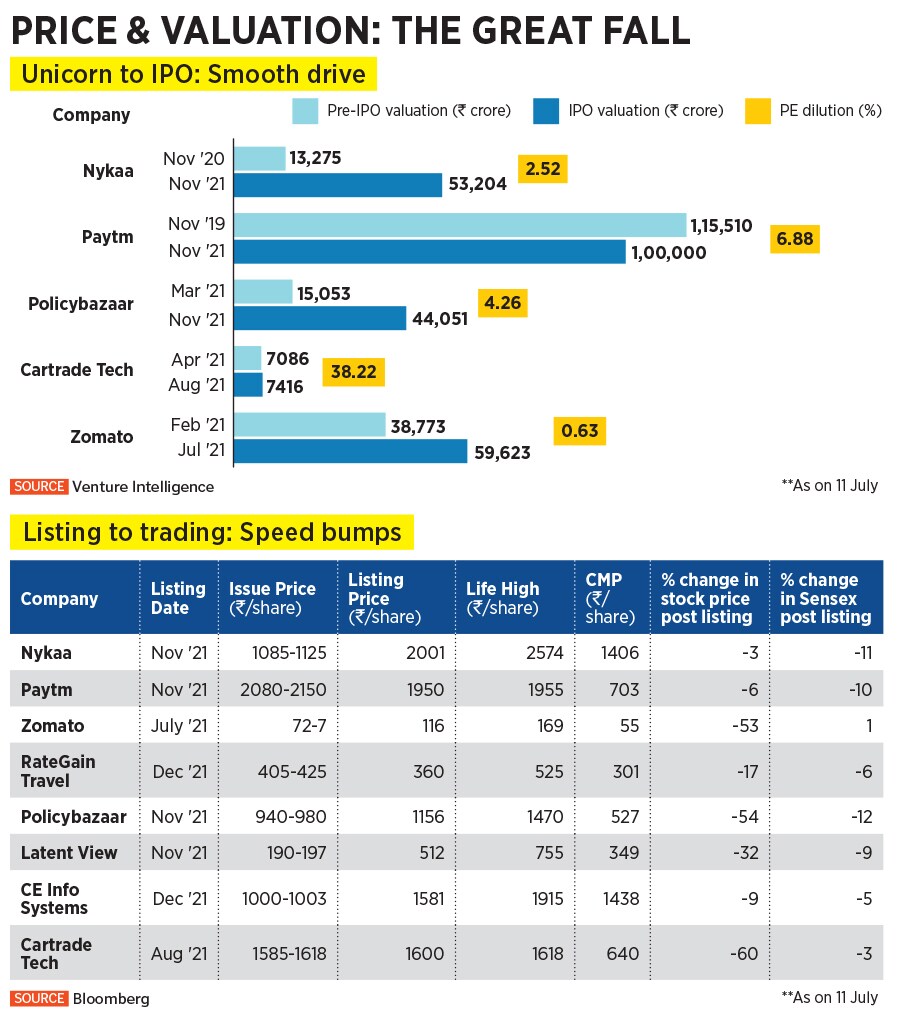 These are snippets of conversations with investment bankers, corporate lawyers, deal advisors, and industry insiders who Forbes India has interviewed. New-age technology growth stocks have vapourised on the bourses, leaving behind fumes of wealth destruction that cannot be pinned on turmoil in the global markets and economy. Often, greed and fear, not financial performance, drove the valuations of these beleaguered companies. But now the music has stopped and high-flying founders and investors are walking on ground again.