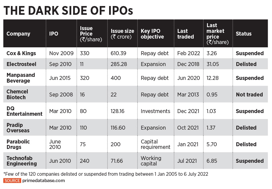 Since 2005, according to Prime Database, 501 companies got listed on the exchanges in India, while over 120 got delisted or were suspended from trading, or do not exist. In most cases, the delisting or suspension took place a decade or so after the company’s IPO their final share price often less than a tenth of the issue price.