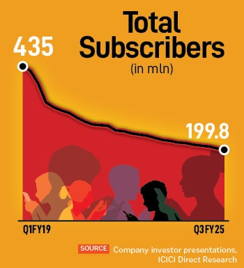 But there are still some real concerns that Vi must face: Its revenues have risen only around 6 percent to Rs 11,360 crore in Q3FY25 from September 2023 levels, despite average revenue per user (ARPU) from tariff hikes rising 16 percent in the same period. Its customers are too price sensitive—the churn continues as it upgrades to 4G from 2G—and Vi has not been able to arrest its falling subscriber base for the past 26 consecutive quarters (see chart). Vi has been busy upgrading its subscriber base from 2G to 4G, providing more bundled offerings and higher value products to these subscribers.