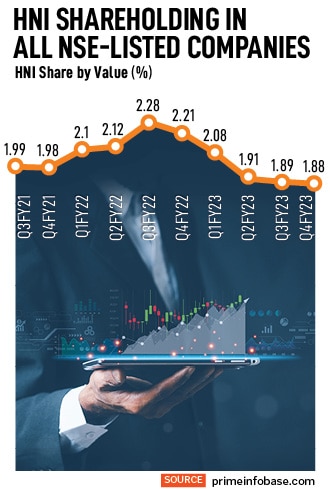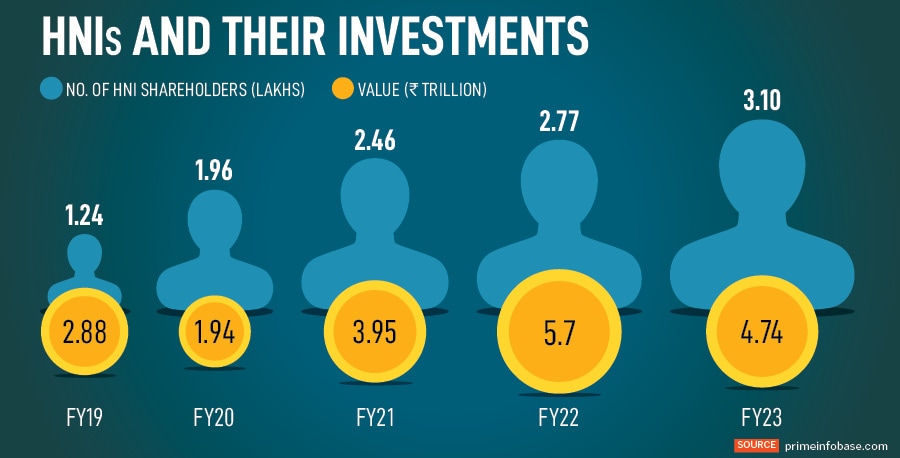 However, their value in the shares held has fallen, understandably, as the overall market capitalisation has also eroded in the last one year. In FY23, HNIs’ total holdings in all shares was at Rs 4.74 trillion, lower than Rs 5.7 trillion in the previous year. In FY19, it was Rs 2.89 trillion but had fallen to 1.94 trillion by the end of FY20.