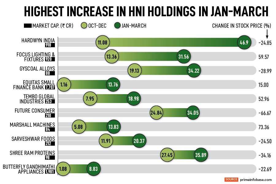 The top 10 stocks (all listed on NSE) that HNIs increased their holdings in were Hardwyn India, Focus Lighting and Fixtures, Gyscoal Alloys, Equitas Small Finance Bank, Tempo Global Industries, Future Consumer, Marshall Machines, Sarveshwar Foods, Shree Ram Proteins and Butterfly Gandhimathi Appliances.