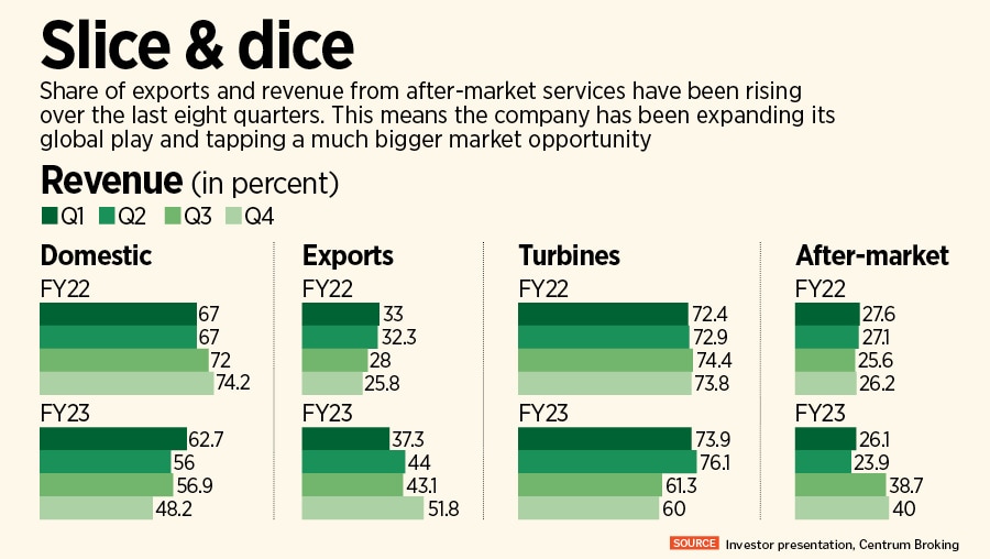 “While its overall global market share stands at 12-13 percent, the markets where it operates it has cornered 22-24 percent," the report underlines. While exports growth was driven by small and large power ranges of turbines from regions such as Europe, Africa, Central, South and North America, they will remain core focus and form a significant part of long-term growth. “Export is expected to contribute over 50 percent of total revenue in medium to long term," the report adds.