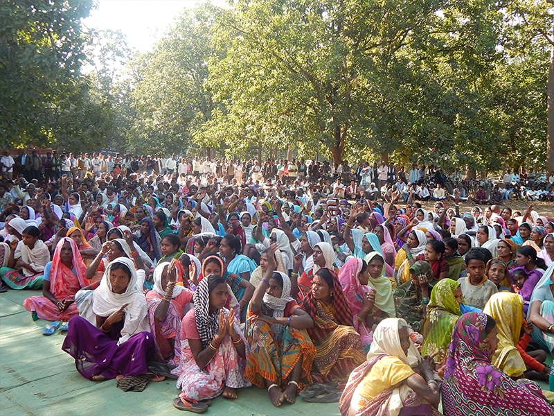 Hasdeo Aranya Bachao Sangharsh Samiti (HABSS) held a meeting in 2014 to oppose mining in the biodiverse Hasdeo forest in Chhattisgarh, an important elephant migration corridor. Though opposed by adivasis and local gramsabhas for over a decade and by people across India and across the world, permission to cut 95,000 trees was given recently and trees were felled at night to make way for coal mining. Image: Alok Shukla captured Chhattisgarh Bachao Andolan in 2014